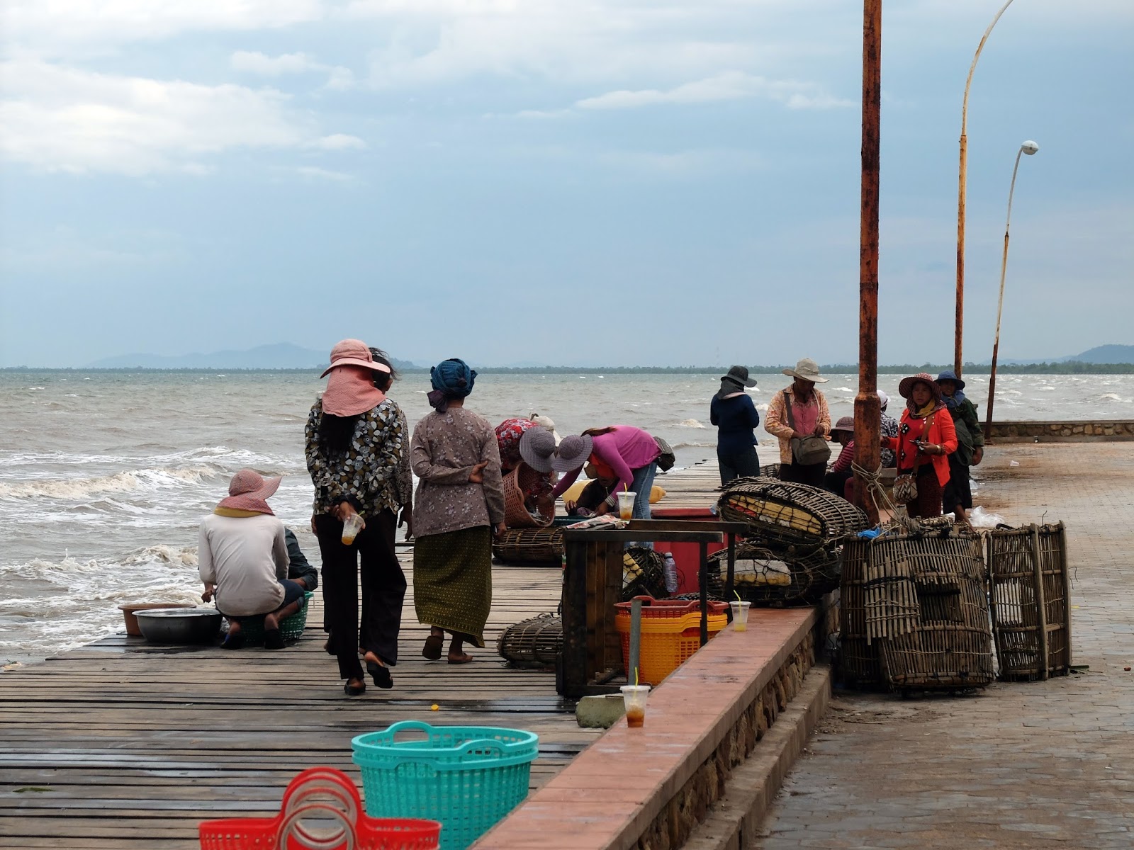 今早的氣色陰陰沈沈,風浪強大,早晨時段的海鮮市場異常地熱鬧,小販和漁夫們聚集在海傍前做買賣,一邊從海里把籠子取上來,一邊再讓小販們選購螃蟹,買了新鮮的螃蟹再去其它地方進行買賣,這裡也是個批發螃蟹的地方。